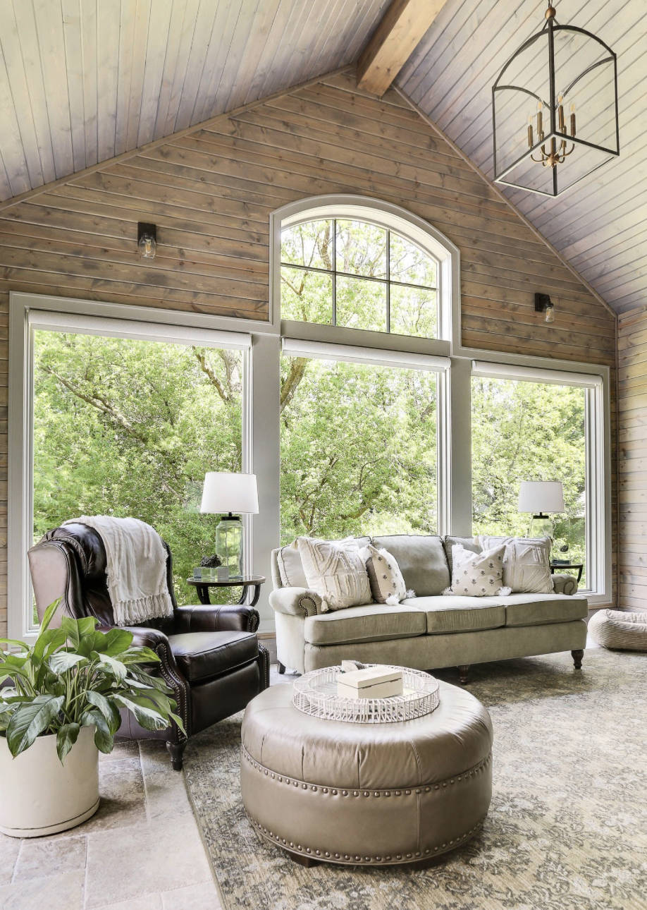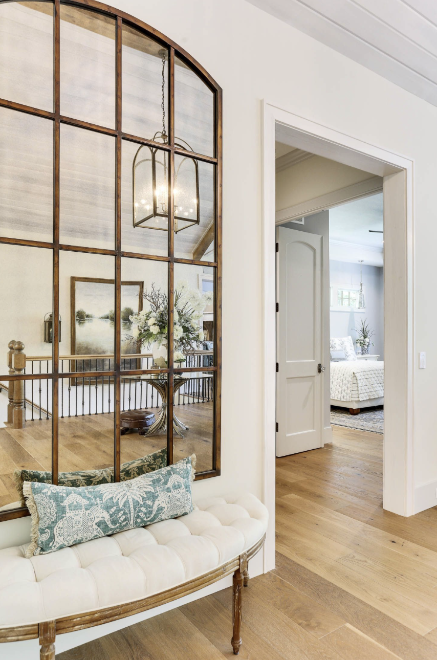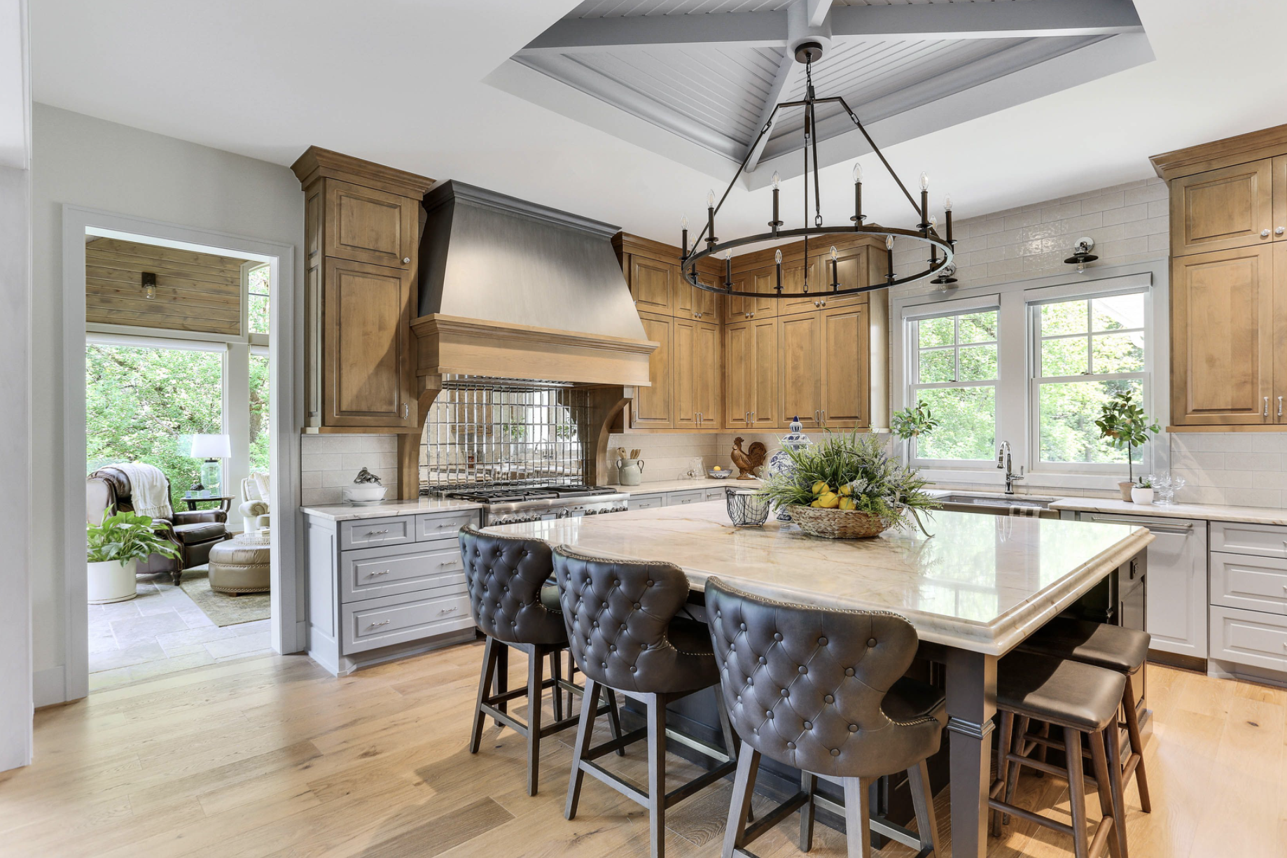 Upon entering, shiplap and clear alder beams envelope the soaring foyer and Great Room vaulted ceilings. Opposing His + Hers Offices echo the homeowners individual personalities and clad in wood wall paneling + ceiling details. An enviable main level Master Suite filled with natural light and wood flooring transitions into the luxurious Master Bathroom with heated Ted Baker floor tile, raised platform countertop, and a concealed television behind a mirror panel. A captivating 3’ x 5’ crystal chandelier suspends from the vaulted whitewash shiplap and clear alder ceiling. The Master Suite also includes an elevated large closet with a window, designer accent lighting, and center island. Within the Kitchen, an impressive 9’ x 9’ Kitchen island is perfect for entertainment and is crowned a black iron chandelier suspended from a wood beam and beadboard ceiling detail. An antique mirrored tile backsplash was installed behind the 48” cooktop to add reflection and dimension to this traditional Kitchen packed with modern conveniences and charm. Additional appliances such as paneled refrigeration drawers conceal the Butler’s Pantry. The four-stove fireplace pops against custom wood-stained walls. The Powder Bathroom is an Art Nouveau jewel box with William Morris wallpaper, mint accents, crystal chandelier, and vintage modern plumbing fixtures.