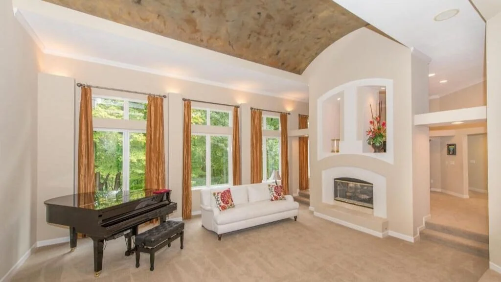 We didn’t stop there. We completely updated two fireplaces in the home. To change these features dramatically, we deleted a fireplace in the Study and utilized this space for custom build-ins in the now-Children’s Nursery and added two closet systems, a custom Queen-size bunk bed with lighting feature, and a book ledge with a hidden door. This hidden door element reveals an adorable newly-introduced Kids’ Bathroom within the luxury Nursery space. The Master Bathroom went from a dingey beige haze to a bright and vibrant Master Bathroom with the use of designer and marble tiles, custom cabinetry systems, and matte brass plumbing fixtures. heated tile flooring and a steam shower add to the newly-imagined Master Bathroom experience. Though the Kitchen layout was not changed, we transformed the Kitchen by replacing the existing elements such as the heavy soffits, track lighting, and bar-height countertops to name a few! We introduced new custom cabinetry designed with a cabinetry door featuring the remodeled Laundry and new chic Pantry space to add greater functionality! Cambria quartz countertops, new tile backsplash, and tile around the skylight that once had track lighting around the perimeter now has a wood beam with designer pendant lights suspending to highlight the island below. Shiplap, beams, and new lighting were added to the Family Room where the ceiling and architectural black windows and doors dramatically update the space. The Powder Bathroom now wows with an assortment of textural tiles, lighting elements, shelving, and designer wallpaper. The Basement Bar received a wood tile treatment, concrete sink, and black stainless sink faucet and open display shelving. The Sunken media Room is now a light and inviting space with new wood flooring, graphic carpeting, and new wall and millwork finishes. We added an entire In-Law Suite with a Bedroom space—perfect for lounging and with a full Bathroom. The list goes on, but these are some of the highlights for this bold and elegant family retreat.